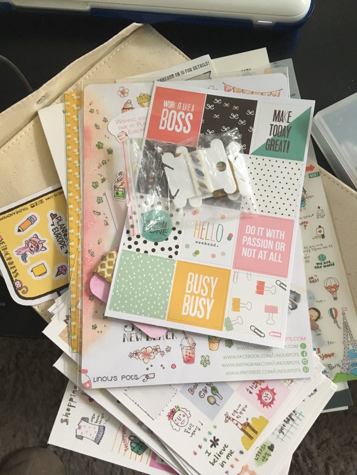 Pictured above are the stickers and stuff I will try to use up. Yes, it’s a lot and not even all of what I own. Some are from the recent plannercon but some I’ve owned for about 5 years!!!