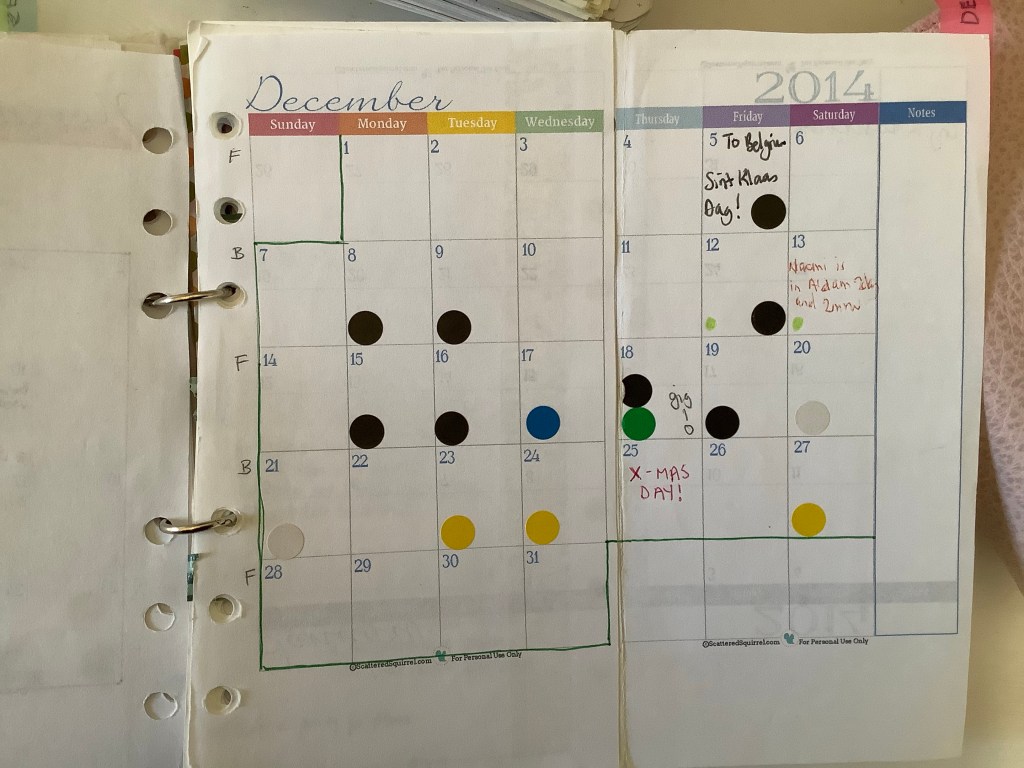 Colour coding is something that I used when I started seriously using my planner for organising my life (see below inserts from 2014!). Because the month on 2 pages were usually too small for me to write anything significant on it, I would use coloured dot stickers or even just a coloured pencil to indicate events, appointments and so on. I really loved this as I could see at a quick glance what my month was looking like.