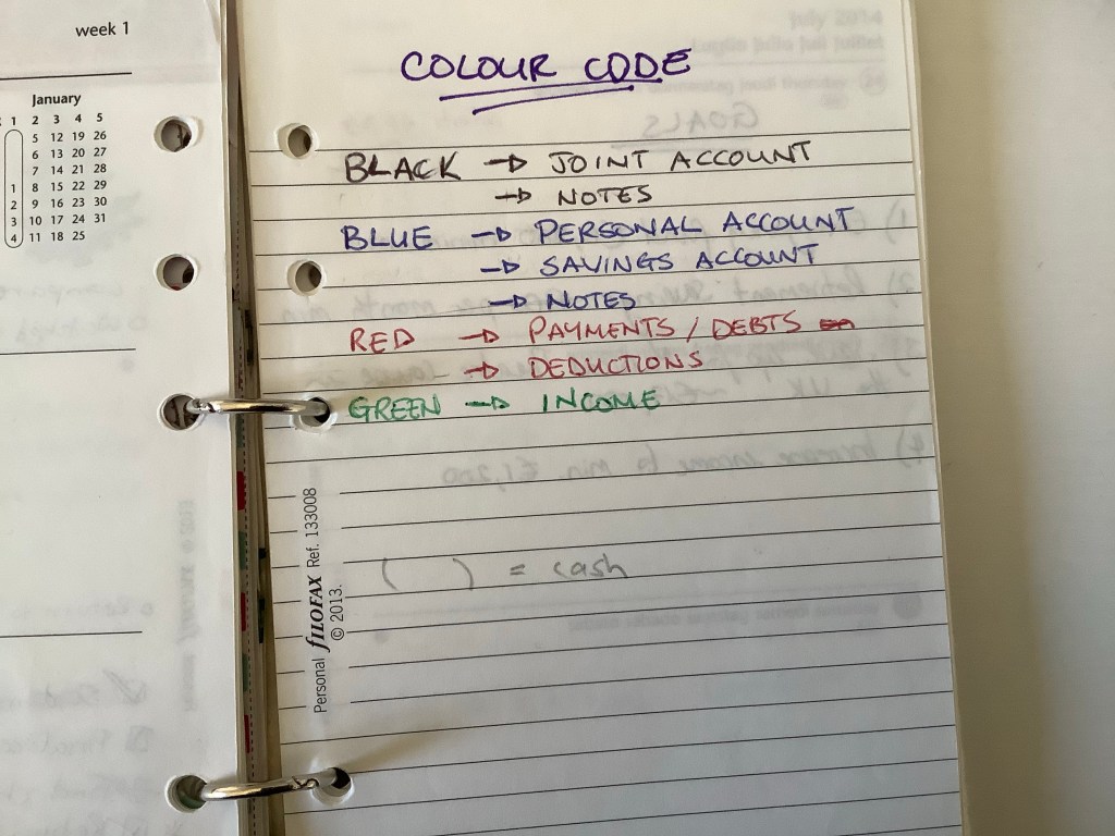 Another place I used colour coding was when I was attempting to track my cash flow. Here I used different coloured pens to indicate from which account was I spending from.