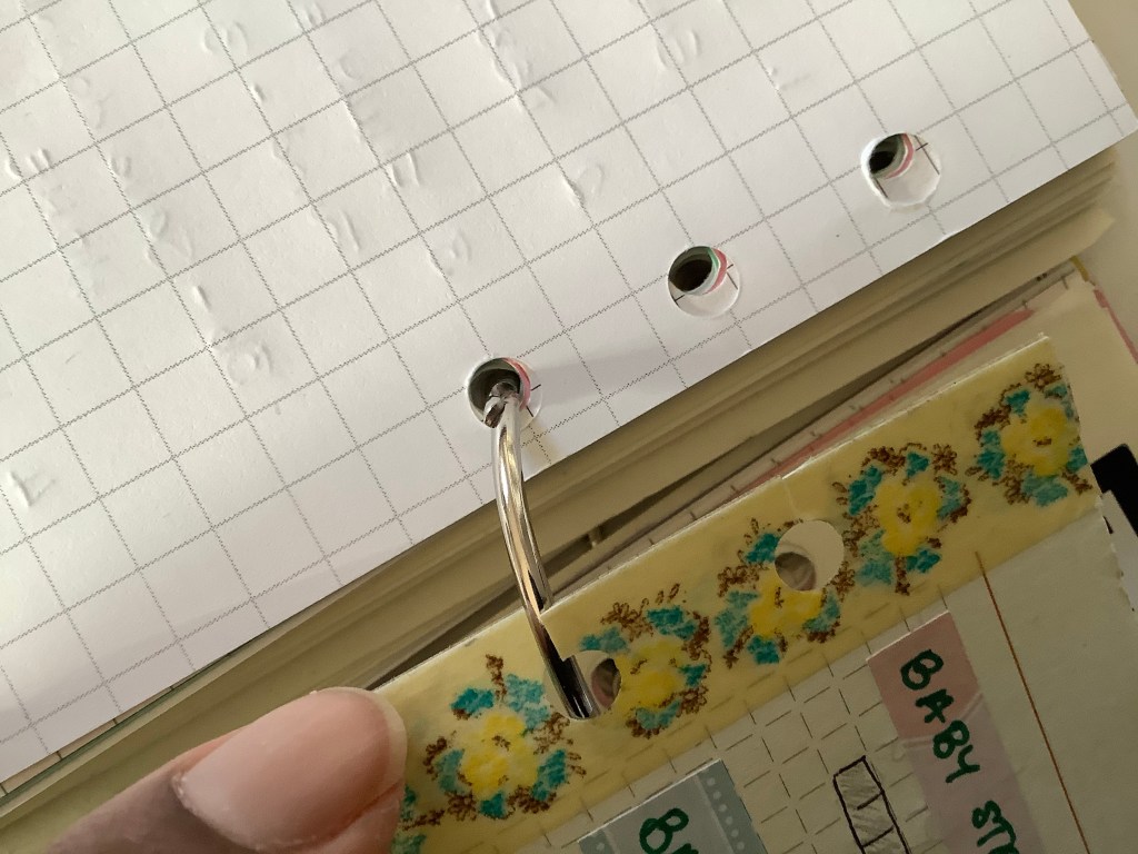 However, as much as I love that advantage, always opening and closing your rings can be tiring sometimes, especially if the ring mechanism is tight and/or is being stubborn. This is where making slits in the holes is genius! By doing this, you can take your inserts in and out of the rings without having to actually open the rings! Love it!!! Now, if you do this often then of course you risk damaging the inserts, but the inserts don’t get damaged if you reinforce the holes. The inserts still stay in the rings despite the slit that you’ve made. You can do this with traditional hole reinforcers (the donut looking stickers) or washi tape (as shown in the picture above).
